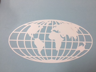 White outline of a world, photo shown has a blue background to show actual image.. 8″ x 4.25″